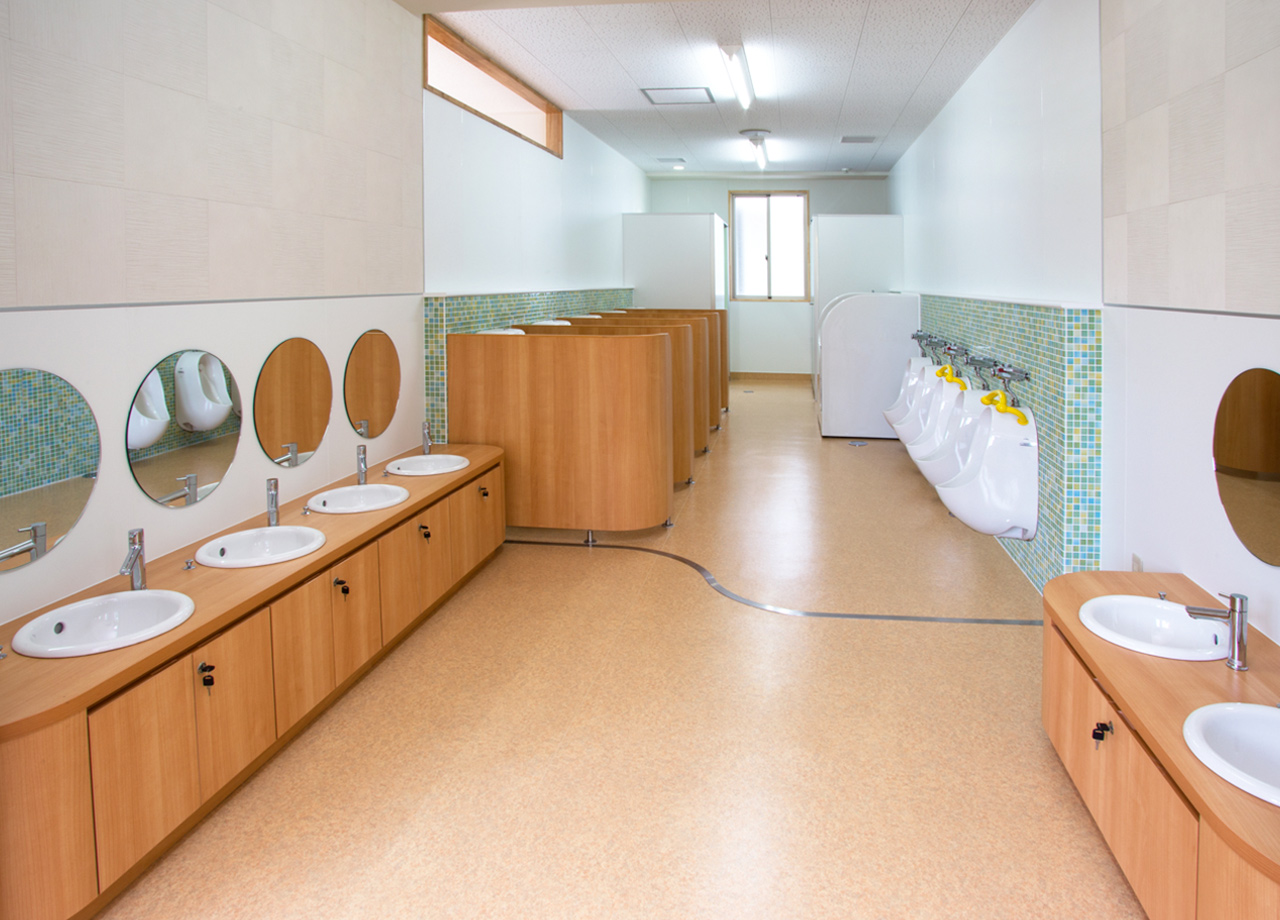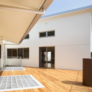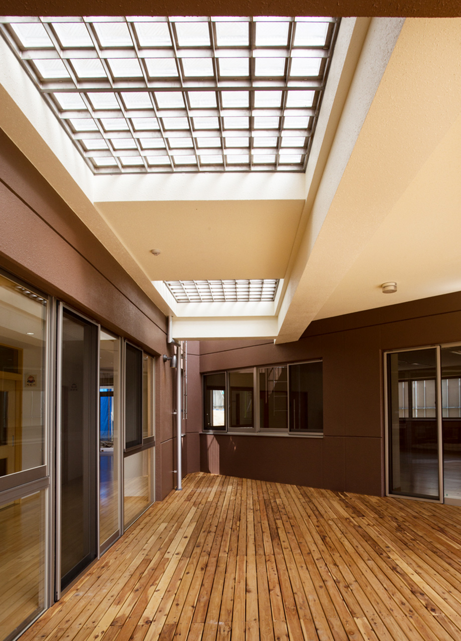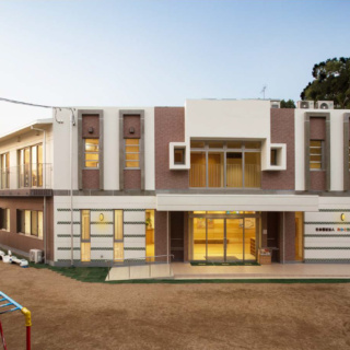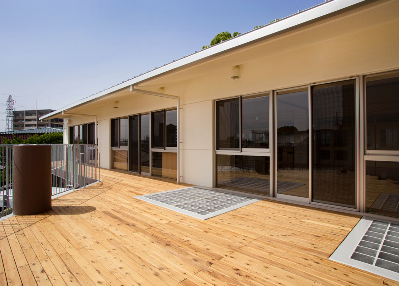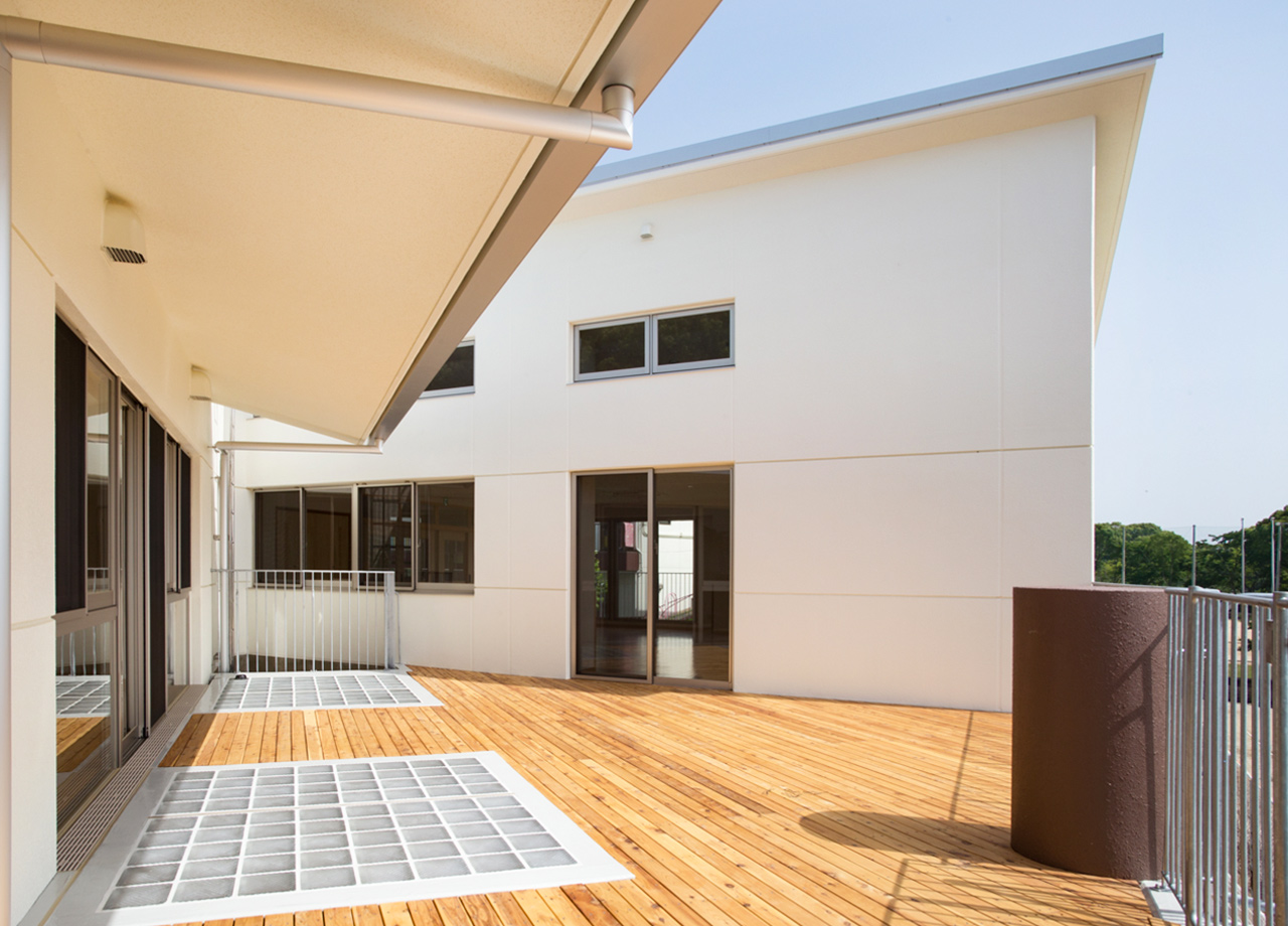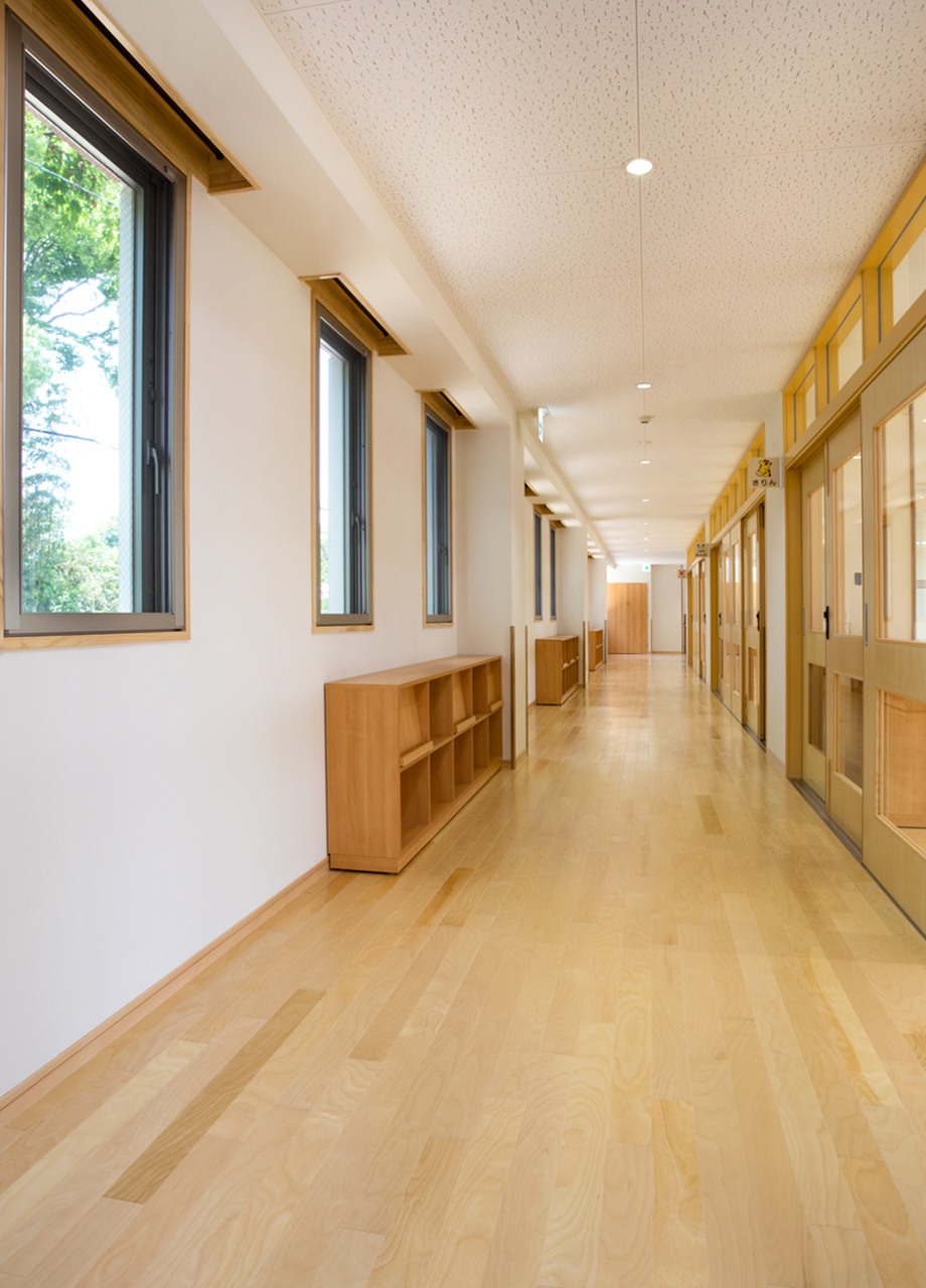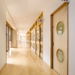 | 建築概要 | ■外観 敷地の周囲は住宅地・学校・緑地と多様な環境に囲まれており、車一台が通過できるような道路環境である。住宅側の外観は音やプライバシーを考慮し、リズム感のある同じ形の開口幅窓デザインとし、緑地側は既存園舎と連絡が取りやすい位置に玄関を配置。2階には遊び心を表現するような望遠鏡的な窓をデザイン。 ■玄関ホール ■0・1歳保育室 ■園児トイレ ■階段室 ■3・4・5歳保育室 ■調理室 ■2階テラス |