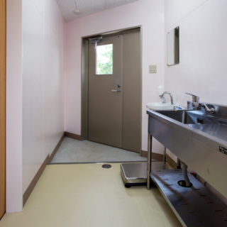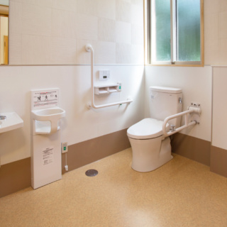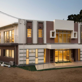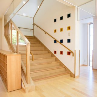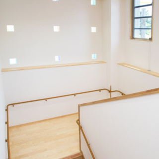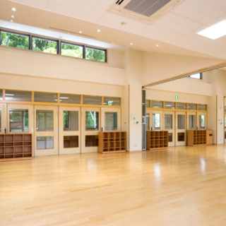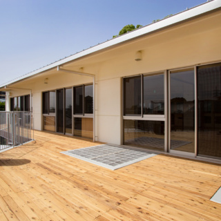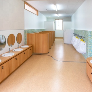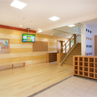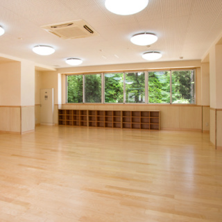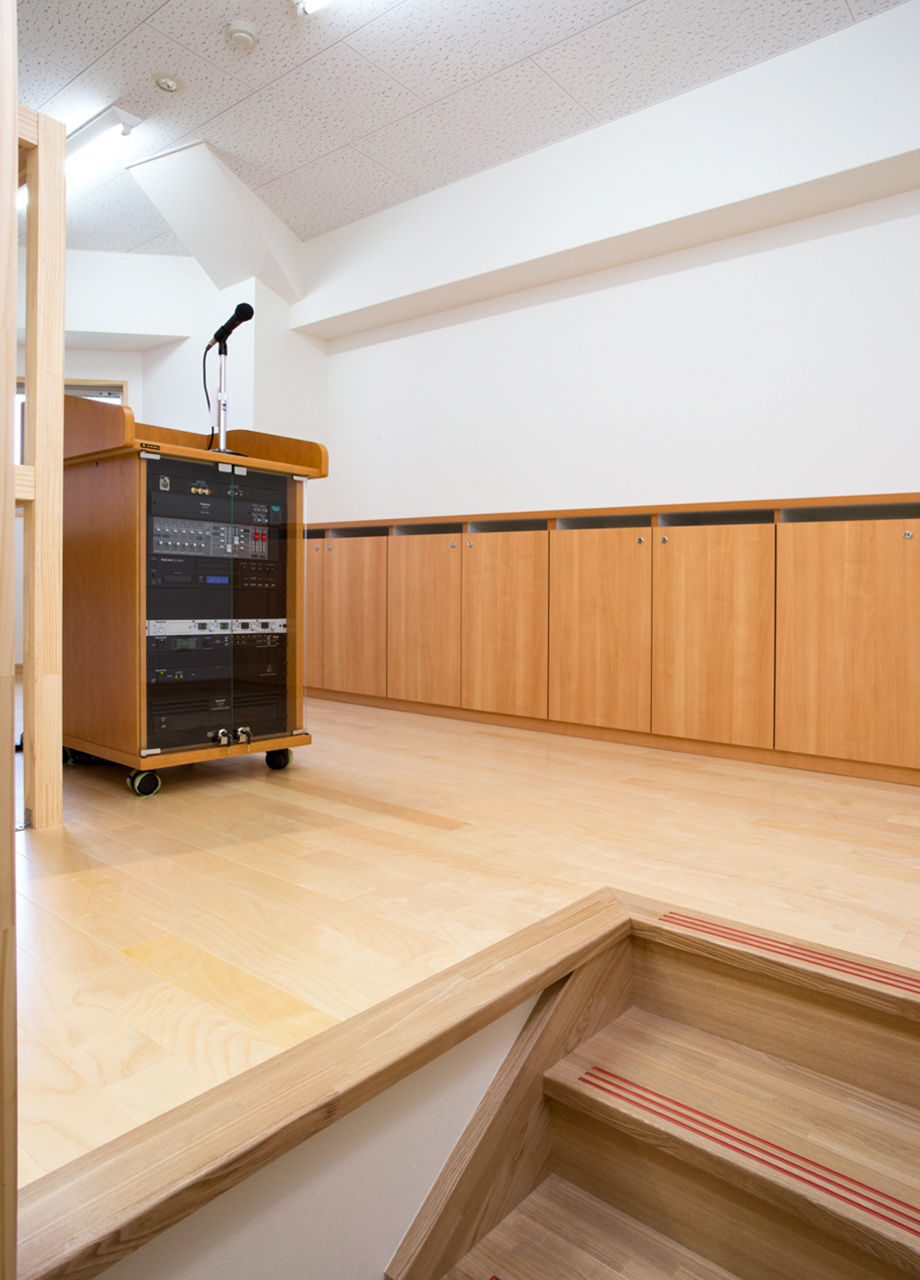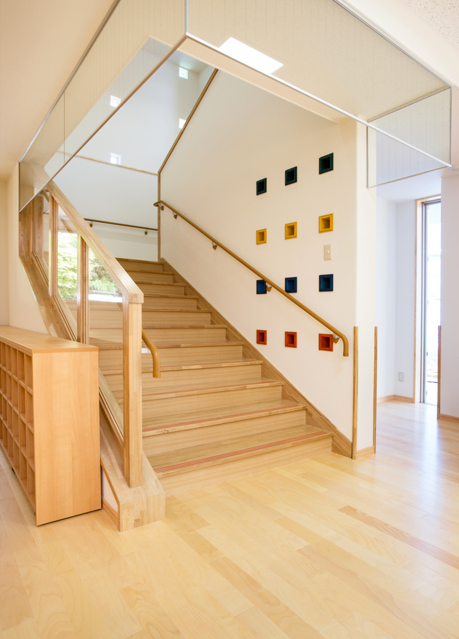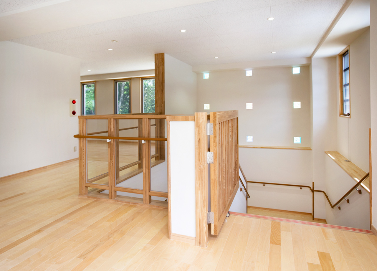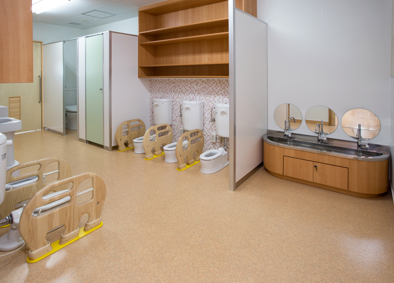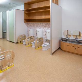 | 建築概要 | ■外観 敷地の周囲は住宅地・学校・緑地と多様な環境に囲まれており、車一台が通過できるような道路環境である。住宅側の外観は音やプライバシーを考慮し、リズム感のある同じ形の開口幅窓デザインとし、緑地側は既存園舎と連絡が取りやすい位置に玄関を配置。2階には遊び心を表現するような望遠鏡的な窓をデザイン。 ■玄関ホール ■0・1歳保育室 ■園児トイレ ■階段室 ■3・4・5歳保育室 ■調理室 ■2階テラス |